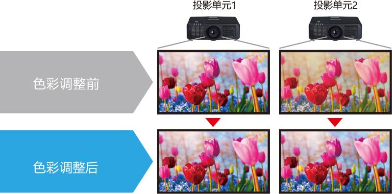 色彩校正功能可以单独调整多台投影系统当中每个投影单元的细微色彩差异,尤其是在拼接显示模式下。可以进行 3 色或 7 色调整。