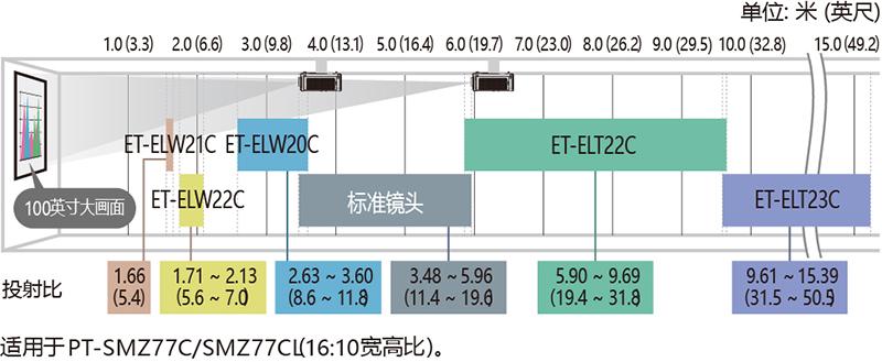 1.02–10.16m (40–400 英寸 ), 16:10 宽高比 选用 ET-ELW22C 时 ,1.52–10.16m (60–400 英寸 ) , 16:10 宽高比 |