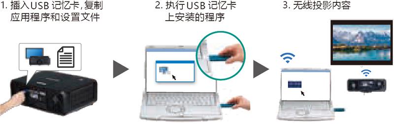 将 USB 记忆卡插入投影机 USB 端口。不到一分钟,就可复制设置文件和应用程序。将 USB 记忆卡插入您的电脑,点击程序图标,并将视频和静态图像无线传输至投影机——无需安装软件和设置网络。