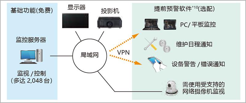 Panasonic视频显示设备监控软件可通过局域网最多控制2,048台投影机,功能系统图实现可视化并可自动搜索设备。此软件支持提前预警软件功能(90天免费试用版)。这些高级功能可实现实时监控,异常检测及事前通知维护时间。管理员可以实现无缝控制和实时监控以防止潜在的问题出现,节省时间的同时提高了系统的可靠性。