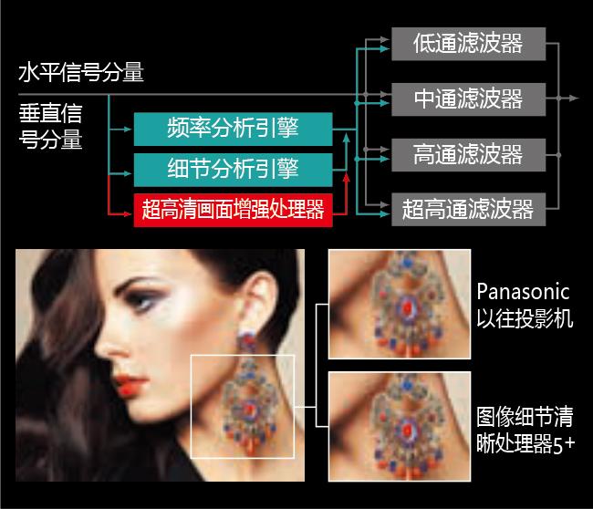 Panasonic新一代电路技术逐帧分析图像,使细节更加清晰。强大的处理算法通过提取分布在四个频段的数据,从而优化、校正了图像轮廓并有效降低图像噪点。超高清画面增强处理器,使4K+图像细节更清晰。