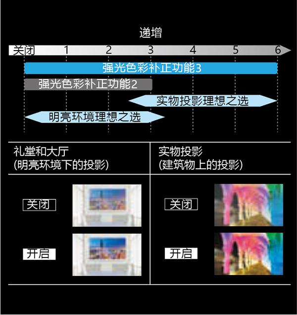Panasonic 强光色彩补正功能3可以防止图像在光线充足的环境下发白,同时保证了实物投影和多台投影应用的呈现效果。通过传感器接收到的信息调节清晰度、伽玛曲线并校正色彩,以适应现场条件。