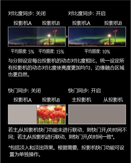 对比度同步功能可在多台投影系统中实现动态对比度的同步控制,确保画质一致性。快门同步功能可实现快门开/关时间的同步。