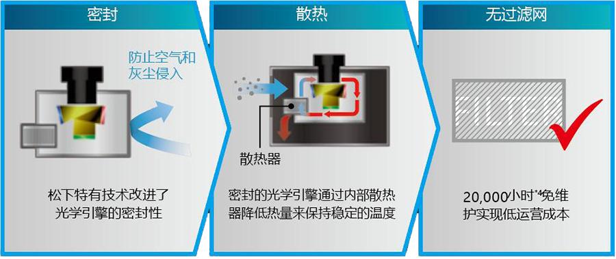 PT-SRQ22KC投影机是采用无过滤网设计的20,000流明级激光投影机,实现20,000小时*4免维护运行。这是通过全密封的光学引擎和特有的单向通风散热的内部冷却系统实现。投影机可长时间连续运行,无需定期维护,节省了运营商的维护时间和成本。无过滤网设计,亮度可控和逐步线性衰减等特点,切实为您节省成本。