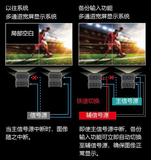 当主信号源出现故障时*5,备份输入设置确保投影机可立即自动切换至辅信号源,确保投影图像不被中断。备份信号切换时不会出现画面黑屏。 注:主辅信号格式必须相同。