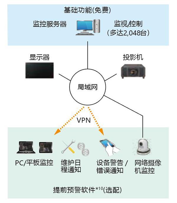 Panasonic 视频显示设备监控软件可通过局域网最多控制2,048台投影机,功能系统图实现可视化并可自动搜索设备。此软件支持提前预警软件功能(90天免费试用版)。这些高级功能可实现实时监控、异常检测及事前通知维护时间。管理员可以实现无缝控制和实时监控以防止潜在的问题出现,节省时间的同时提高了系统的可靠性。